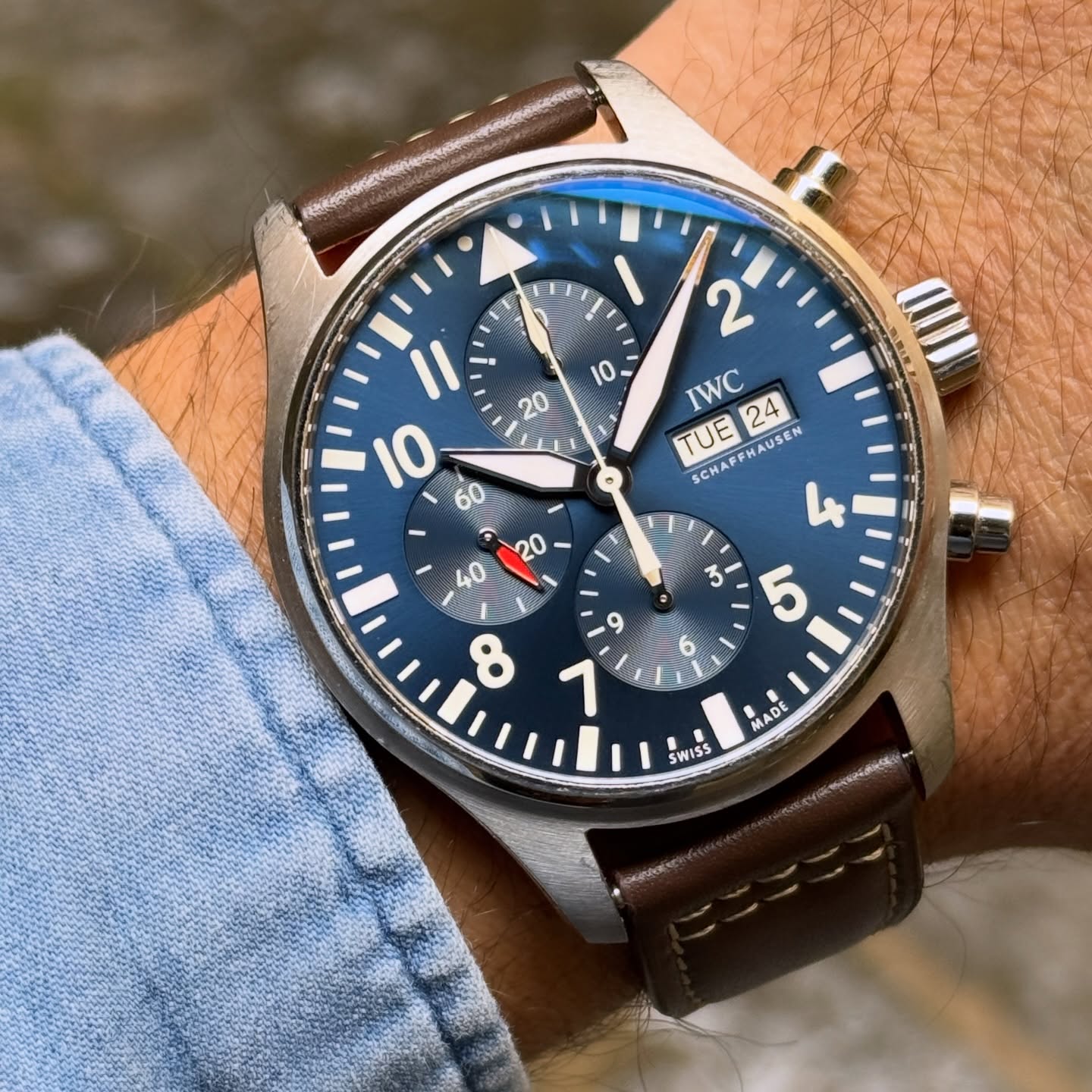 [¾ÆÀÌ´õºíÀ¯¾¾] ÆÄÀÏ·µ ¿öÄ¡ ½ºÆ¿ ºê·¹À̽½¸´ UP!! Å©·Î³ë±×·¡ÇÁ µ¥ÀÌ & µ¥ÀÌÆ® ³ªÀÌÆ®ºí·ç ´ÙÀ̾ó ¿ÀÅä¸Åƽ ¹«ºê¸ÕÆ® iwc0367 - IWC Pilot's Watch Chronograph Day Date Sun Dust Blue Dial Automatic Movement
